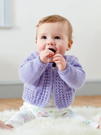 This pretty cropped cardigan has a simple lace border and includes long and short sleeved options.