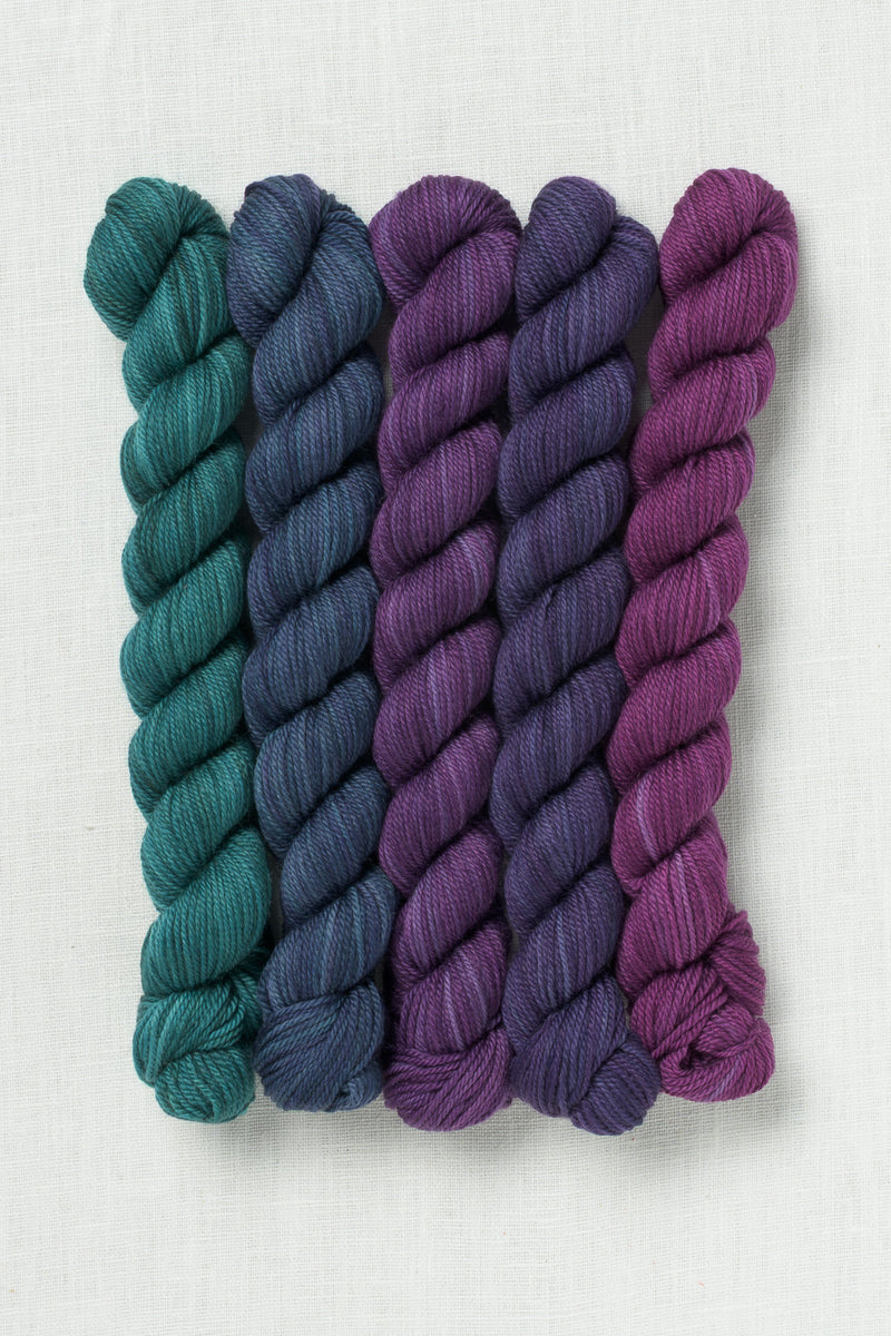 This fun set of 5 mini skeins will really get the creativity flowing. The colorway collections range from shade gradients to complementary palettes. We love these for cowls, hats, mitts, shawls & colorful stripes or colorwork yokes on sweaters.