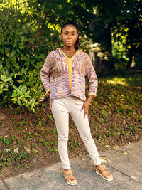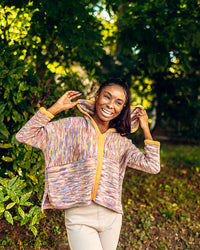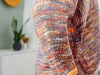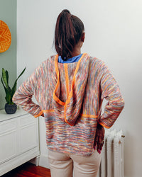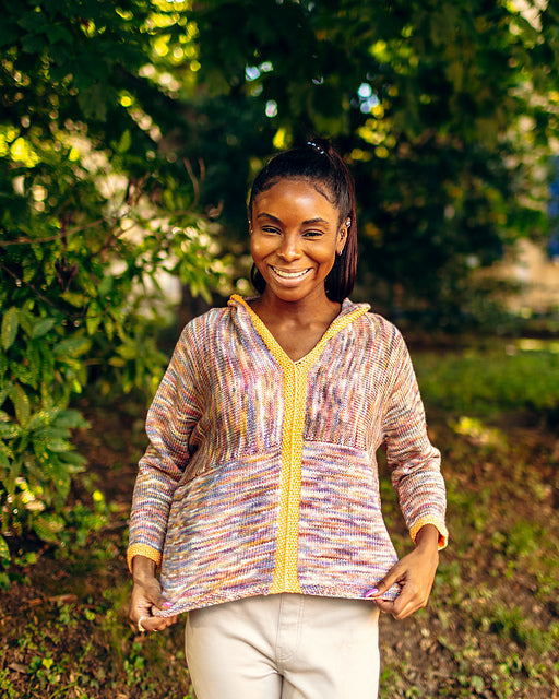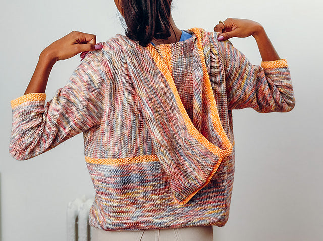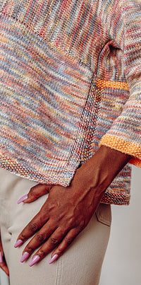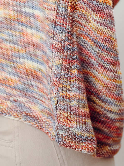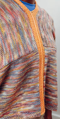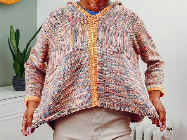 Contrast edging and modular knitting makes this an entertaining knit, while the oversized proportion in a delicious drapey fabric make it even more fun to wear.