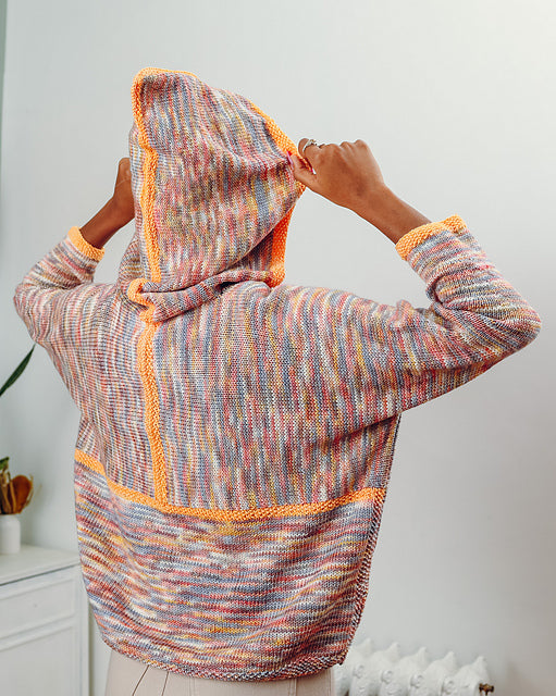 This project begins by working the back sections of the right and left hood first, with each piece worked sideways beginning at center back, then these pieces are set aside. The right and left upper bodies are each worked from side-to-side, starting at the sleeve cuff and working in towards the center of the body. At the side of the neck, the upper body divides for working the back and front separately. Each back is worked even to the middle of the body where the two backs are joined using a three-needle bind-off. The front stitches combine with the held hood stitches, and are worked at the same time to the front centerline. Stitches for the lower back and fronts are picked up from the upper body and worked separately down to the lower edge.