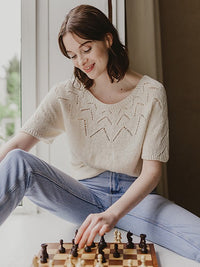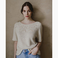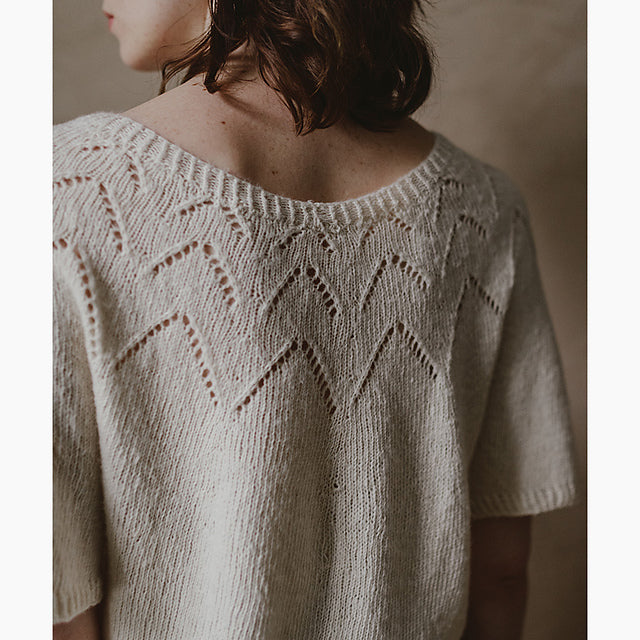The ALAKA short sleeve shirt is worked seamlessly in rounds from top to bottom. Directly below the neckband, an inverted V eyelet pattern forms a decorative round yoke. The pattern is gradually expanded until the necessary width is reached. Finally, the sleeves and body are separated and continued in sequence, with the lace pattern continuing down the middle of the sleeves.