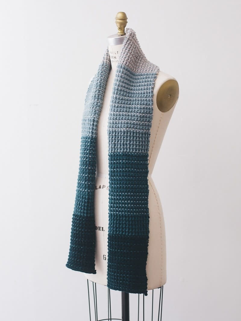 A squishy slipped stitch combined with the ease of garter stitch makes this scarf a simple knit. Dark colorways fade to light in the center of the scarf, then back to dark at the end.