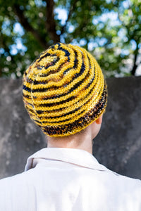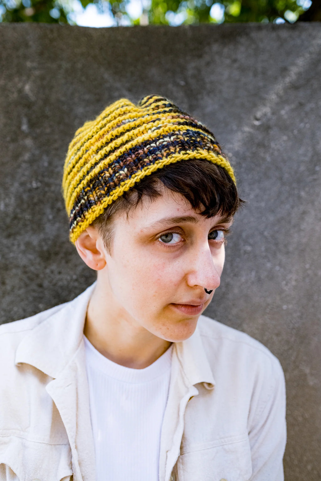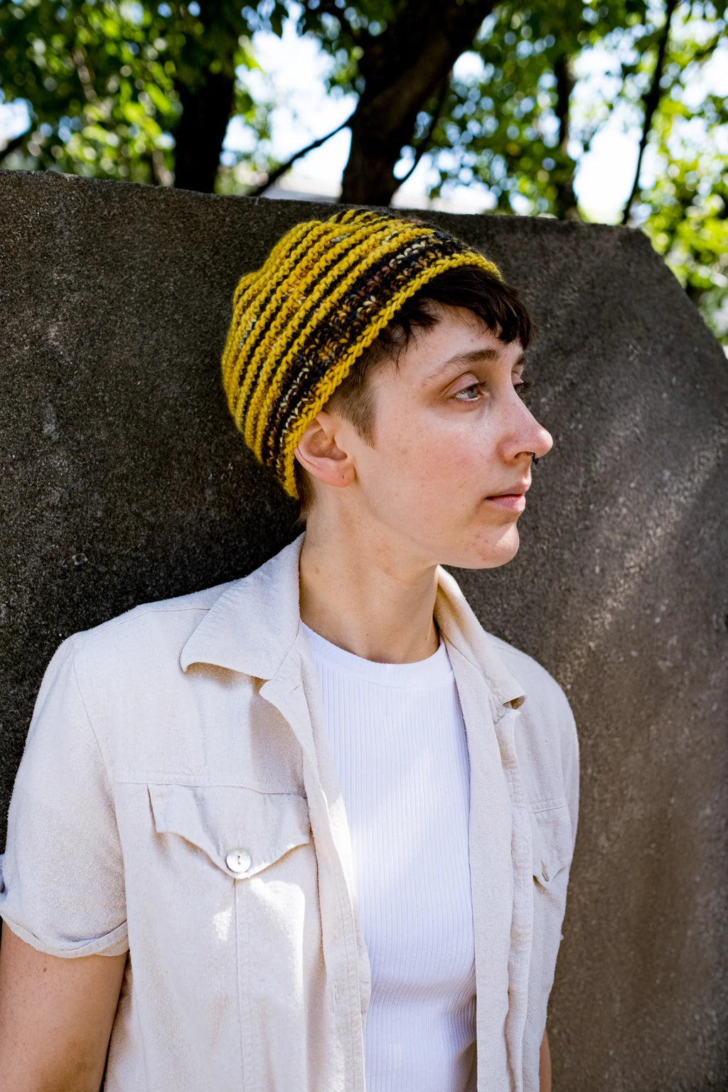 The Thunder + Lightning Hat uses Maxima in Daffodil and Beehive for a charming half-and-half hat. The left side of the hat has stockinette stripes of solid color, with garter ridges in multi, while the right side of the hat has ridges of solid color on stockinette stripes of multi!