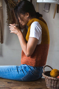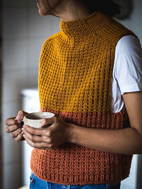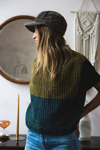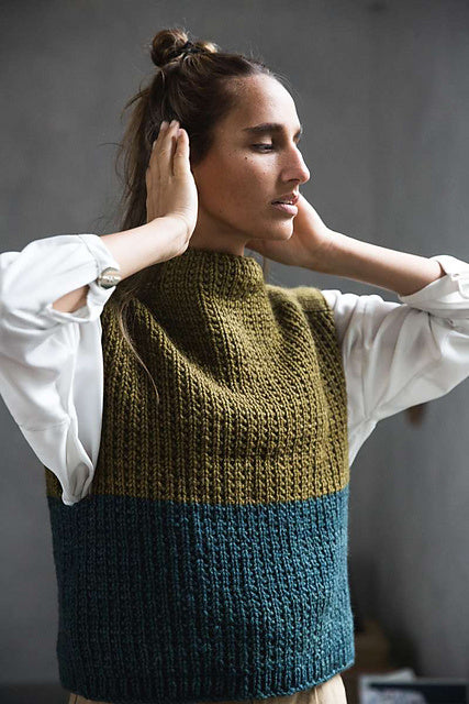 The Timbó Vest is a simple yet interesting knit, suitable for beginners and fast enough to become your go-to gift project. It is worked from top down in an easy broken rib stitch, with a stockinette shoulder detail.