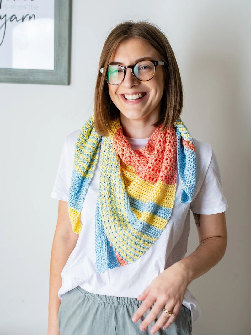 The Tri-Color Shawl is a crochet shawl pattern made with light weight yarn that has a skill level of easy.