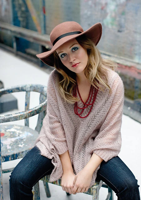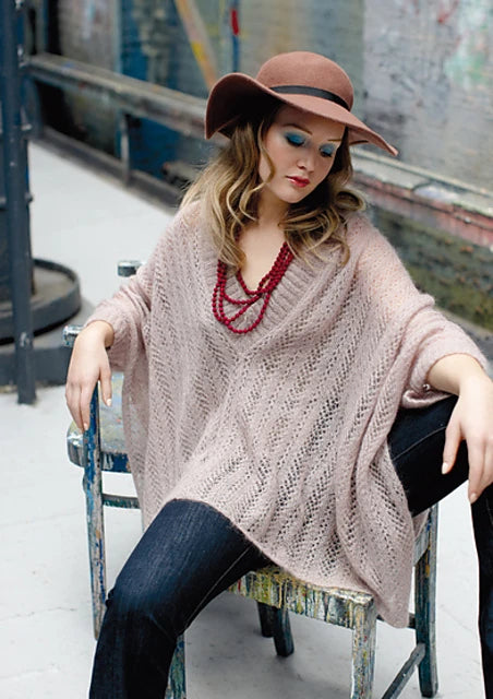 Knit this women's lace top, a design by Sarah Hatton, using the beautiful yarn Kidsilk Haze (kid mohair and silk). A poncho style v necked top using lace and rib bands, this knitting pattern is for the intermediate knitter.