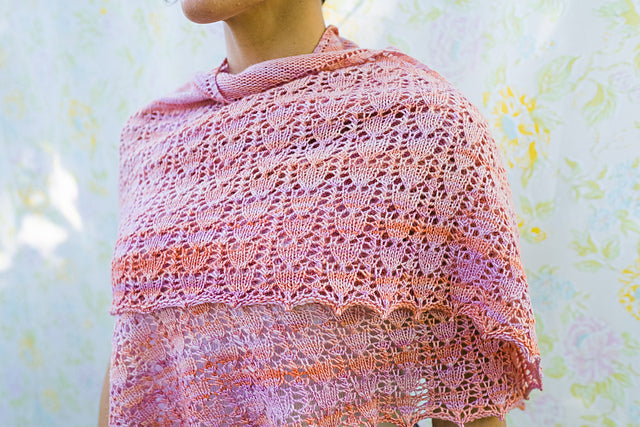 This is a crescent-shaped shawl. It begins with a garter tab cast-on followed by rows of stockinette stitch with increases worked at each end of both RS and WS rows.