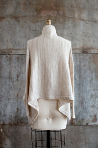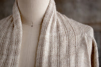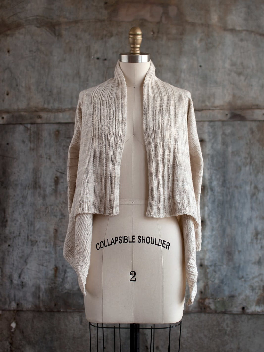 This cardigan is worked from side-to-side in one piece. The opening for each sleeve is worked with waste yarn, then “unzipped” later. The unzipped stitches for the sleeves are then picked up and the sleeves are worked seamlessly using short rows to shape the sleeve caps. The cardigan is designed to be loose-fitting and flowy with simple details and clever one-piece seamless construction.
