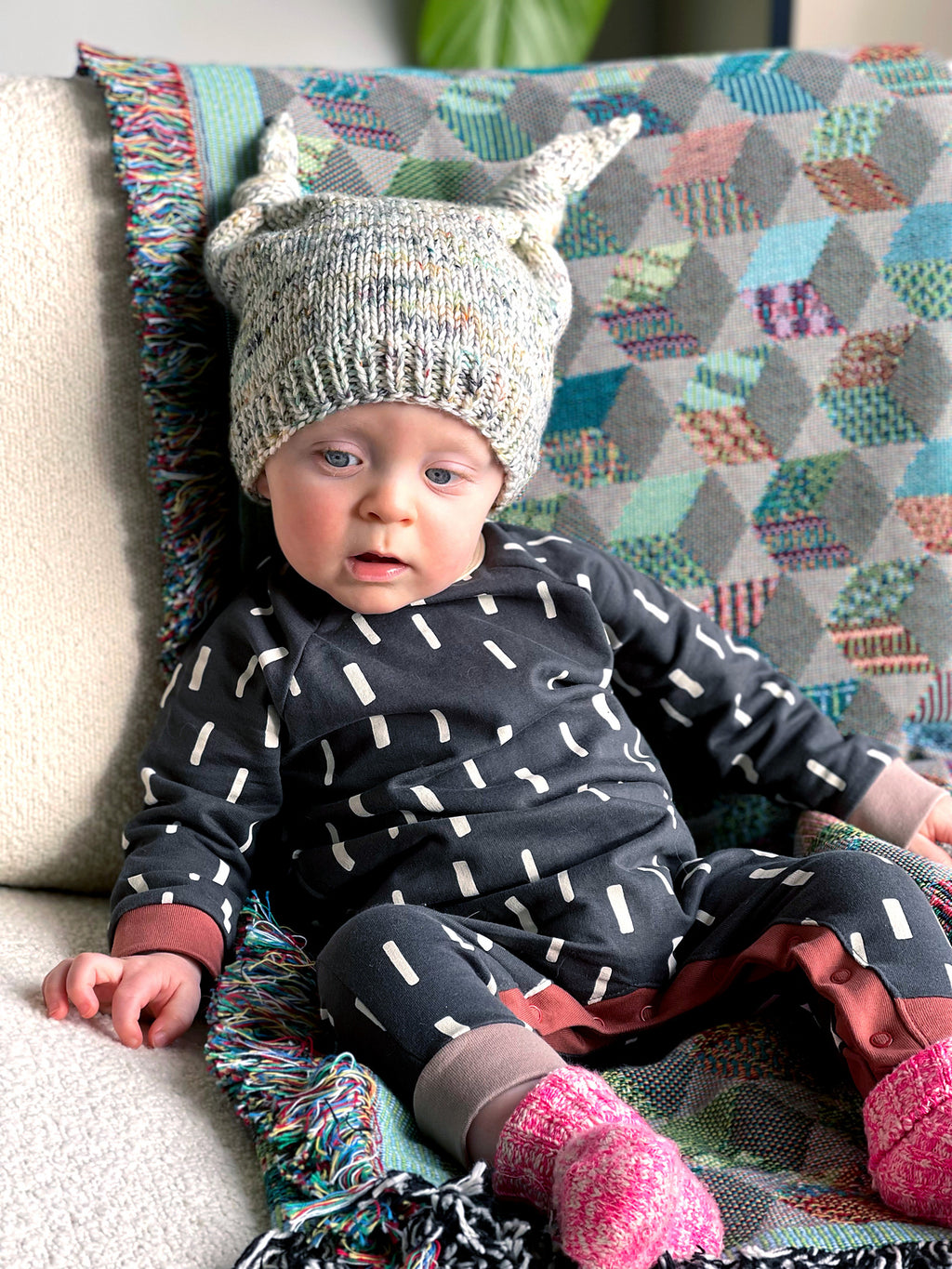 I love funny hats on babies! I included 2 sizes. Jay is wearing the bigger size, he is 10 months old. The smaller size would be for smaller babies, or babies with smaller heads.
