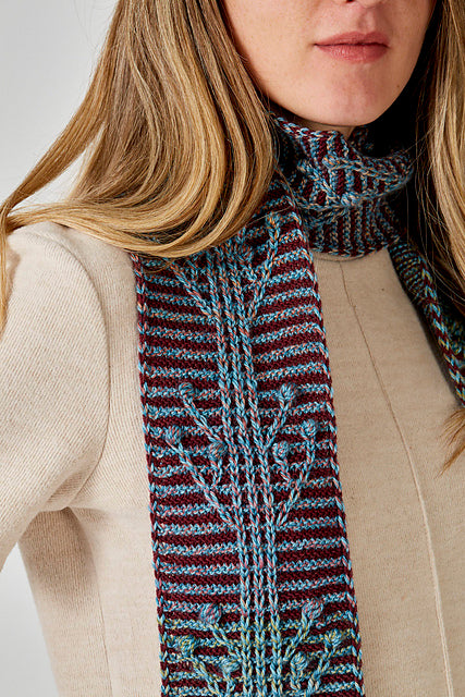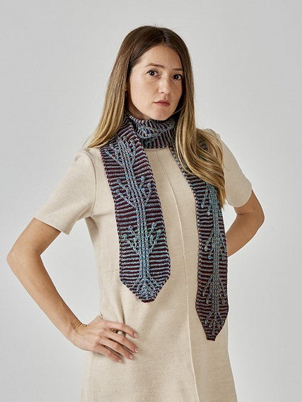 Ulukayn (original Turkish name: Ulukayın) is the tree of life in Turkish mythology. It is at the very center of the earth, the underworld and the sky. Its branches hold up the sky. Its roots penetrate all layers of the earth and extend to the underground ocean. It pierces the sky and rises to unknown heights. This mythologic tree is reimagined in a skinny scarf, constructed with travelling slip stitches and Nupps.