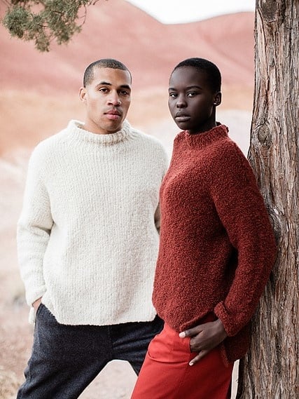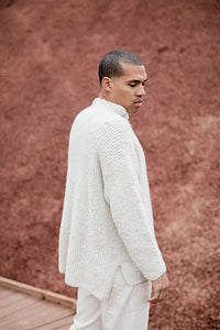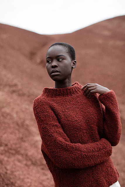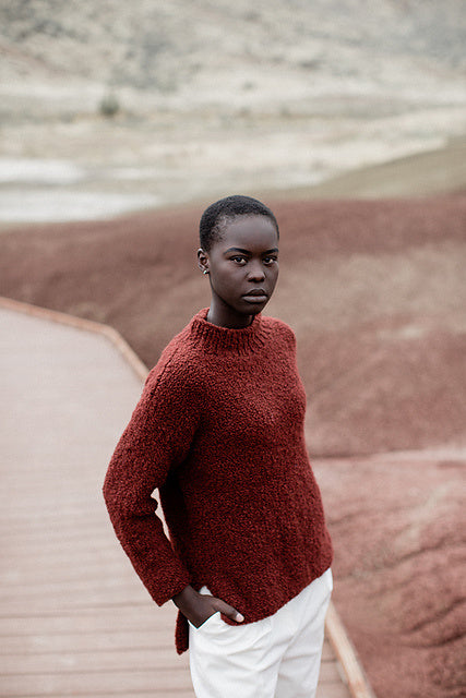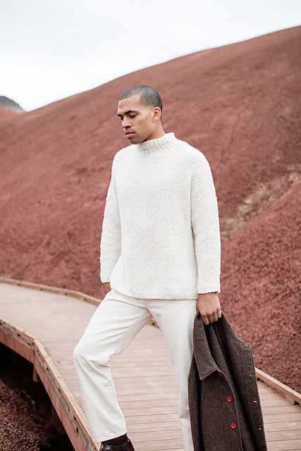 Back and front are worked from lower edge back and forth to the top of the side slit, then body is joined in the round and worked to the armholes. Back and front are worked separately back and forth to the shoulder. Short rows are used for the shoulder and neck shaping. Neck is finished with a classic mock-turtleneck. Shoulders are joined with the three needle bind off. The sleeves are picked up around