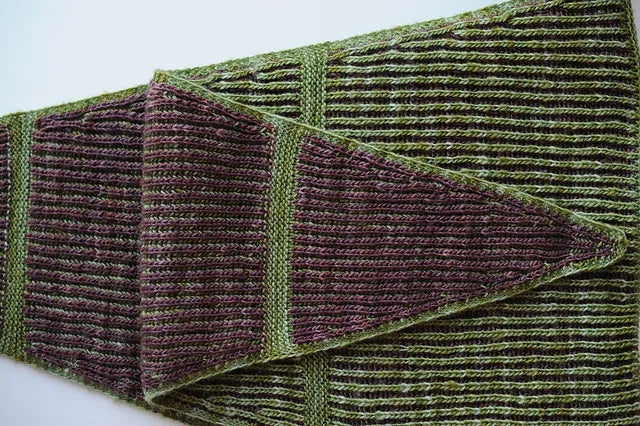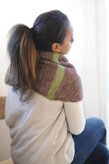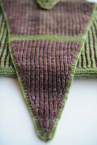 Veloz is a reversible wrap worked in 2-color brioche. Garter-stitch bars punctuate the gentle flow of the shaping, giving the eye (and the hands) a place to rest. Fino’s silk content provides both luster and drape; we chose two colors that are close in value so as to let the varied tones within each skein shine through.