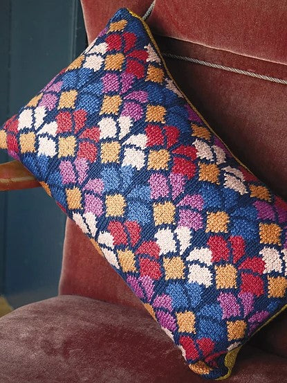 There are three options in this pattern. Version A has a floral intarsia front and solid shade back. Version B. is a coordinating overall stranded Norweigan-inspired geometric design, with a solid shade back. Version C uses the front of Version A backed by the front of Version B.