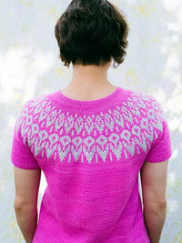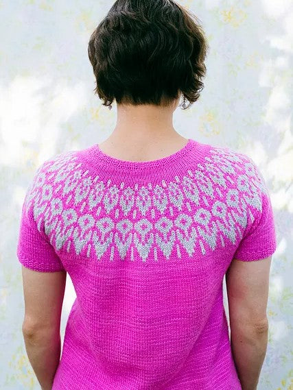 This short-sleeved circular yoke pullover is worked in the round from the top down.