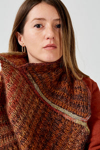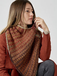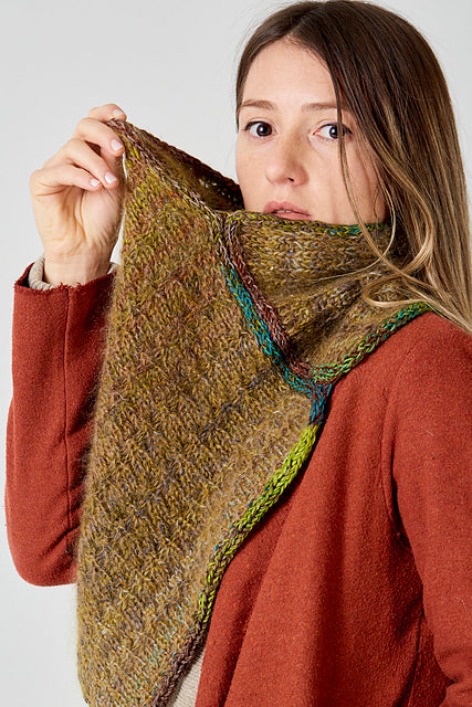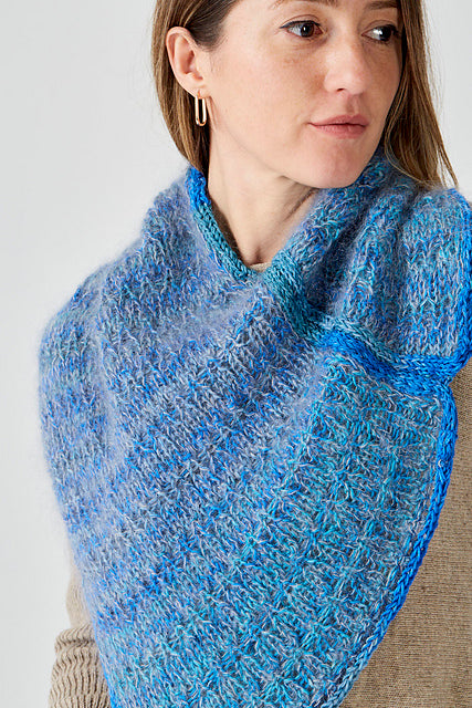 A simple rib lace rectangle in spiral curve layers of color and texture, combining self-striping yarn with lush mohair.