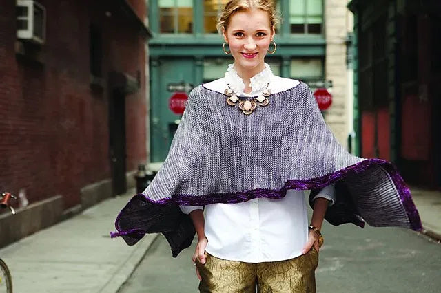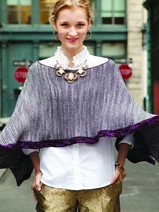 Wooster is an asymmetrical poncho, designed by Tabetha Hedrick, using Malabrigo Yarn Arroyo and Malabrigo Yarn Sock in Plomo and Velvet Grapes