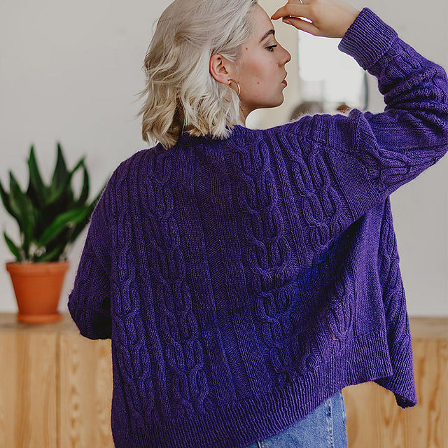 The body of the YOLDA cardigan is worked from the bottom up with sculptural cables. Beginning at the underarm, the front sections and the back are worked separately, and the front sections are worked slightly longer so that the shoulder seam lies diagonally at the back. The sleeves are picked up from the armholes and worked from the top down, first using short rows to form a flat shoulder cap. Then they are continued in the round and finished with broad ribbed cuffs which may be folded or rolled up as desired.